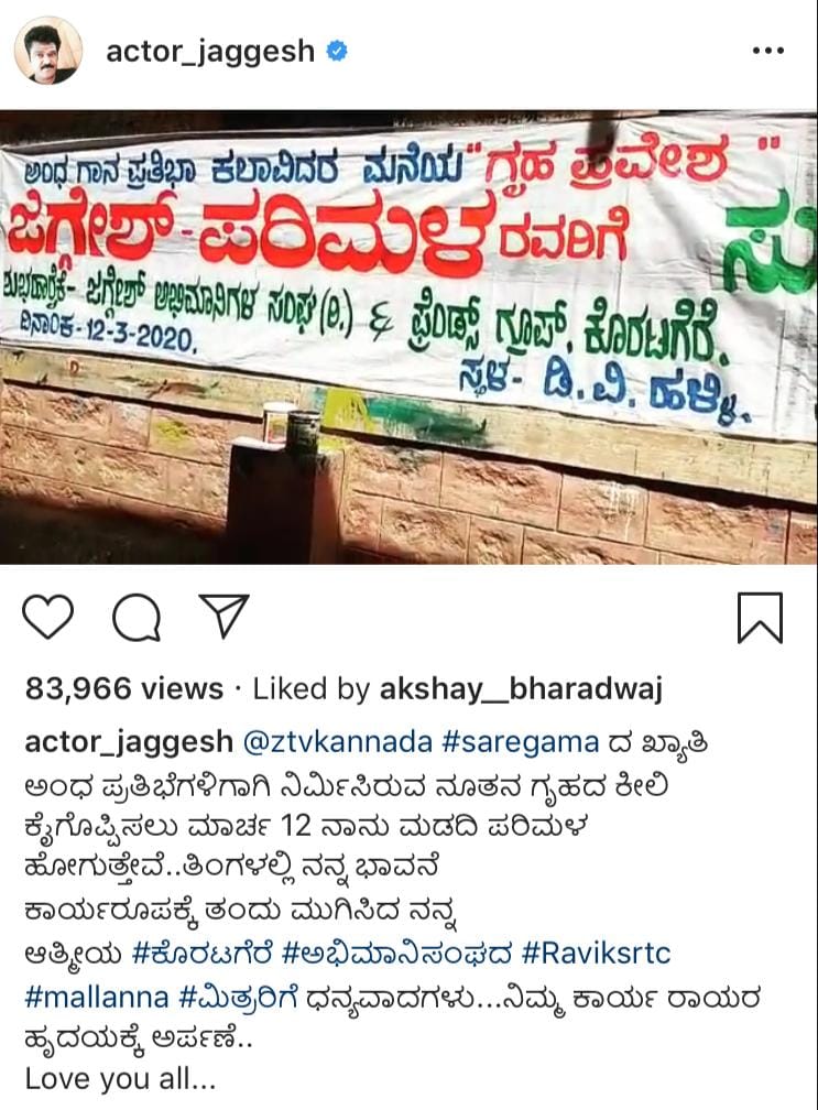 ಕೊರಟಗೆರೆ ಅಭಿಮಾನಿ ಸಂಘದವರಿಗೆ ತುಮಕೂರಿನ ಈ ಅಂಧ ಒ್ರತಿಭೆಗಳಿಗೆ ಮನೆ ಕಟ್ಟಿಸಿಕೊಡಲು ಜಗ್ಗೇಶ್ ಮನವಿ ಮಾಡಿದ್ದರು. ಇದಕ್ಕೆ ಸ್ಪಂದಿಸಿದ ಸಂಘದ ರವಿ, ಮಲ್ಲಣ್ಣ,ಹಾಗೂ ಸಂಘದ ಮಿತ್ರರು ಸೇರಿ ಅಂಧ ಸಹೋದರಿಯರಿಗೆ ಮನೆ ಕಟ್ಟಿಸಿದ್ದಾರೆ. ಬರುವ ಮಾರ್ಚ್​ 12 ರಂದು ಮನ್ ಗೃಹಪ್ರವೇಶವಿದ್ದು ಮನೆಯ ಗೃಹಪ್ರವೇಶಕ್ಕೆ ಜಗ್ಗೇಶ್ ಮತ್ತು ಅವರ ಪತ್ನಿ ಪರಿಮಳ ತೆರಳುತ್ತಿದ್ದಾರೆ.