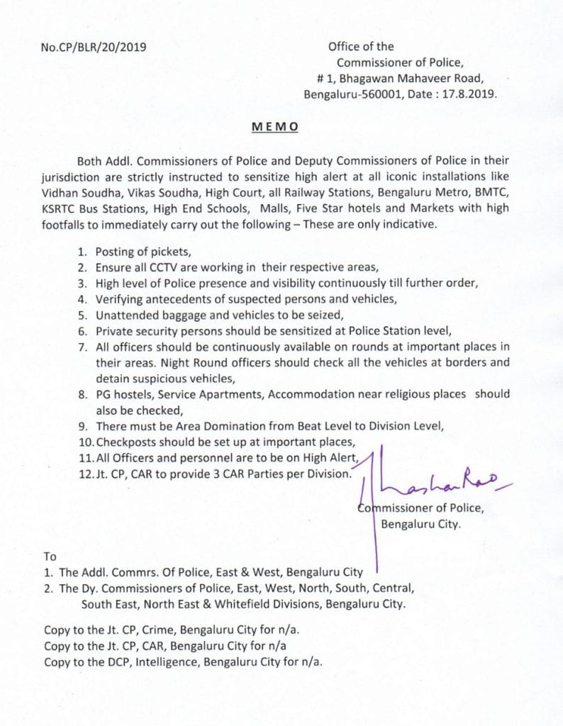 ಬೆಂಗಳೂರು ನಗರದಲ್ಲಿ ವಹಿಸಬೇಕಾದ ಕಟ್ಟೆಚ್ಚರಗಳ ಕುರಿತು ಎಲ್ಲಾ ಪೊಲೀಸ್ ಠಾಣೆಗಳಿಗೆ ಮಾಹಿತಿ ರವಾನೆ ಆಗಿದೆ. ಬೆಂಗಳೂರಿನ ವಿವಿಧೆಡೆ ಚೆಕ್ಪೋಸ್ಟ್ ಹಾಕಲಾಗಿದೆ. ಮಾಲ್, ಮಾರುಕಟ್ಟೆ, ಪ್ರಮುಖ ಸರ್ಕಲ್ಗಳು, ಚಿತ್ರಮಂದಿರಗಳು, ಫೈವ್ ಸ್ಟಾರ್ ಹೊಟೇಲ್ಗಳು, ಬೆಂಗಳೂರು ಮೆಟ್ರೋ, ವಿಧಾನಸೌಧ, ವಿಕಾಸಸೌಧ, KSRTC, BMTC ಬಸ್ ಸ್ಟೇಷನ್, ಶಾಲಾ-ಕಾಲೇಜುಗಳು, ಜನ ಸಾಂದ್ರತೆ ಹೆಚ್ಚಿರುವ ಪ್ರದೇಶಗಳಲ್ಲಿ ಹೆಚ್ಚಿನ ಭದ್ರತೆ ಒದಗಿಸುವಂತೆ ಬೆಂಗಳೂರು ಪೊಲೀಸ್ ಕಮೀಷನರ್ ಆದೇಶಿಸಿದ್ದಾರೆ.
