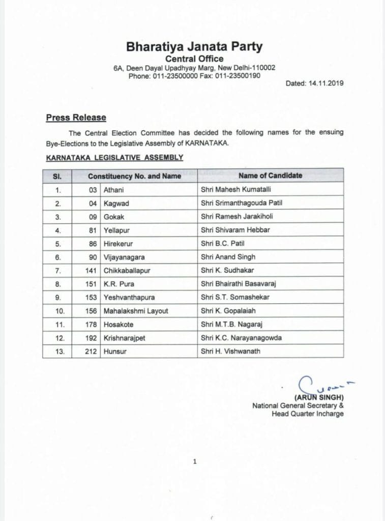 13 ಅನರ್ಹರಿಗೆ ಬಿಜೆಪಿ ಟಿಕೆಟ್ ಘೋಷಣೆ : ಉಳಿದ ನಾಲ್ವರ ಕಥೆ ಏನಾಗುತ್ತೆ..?