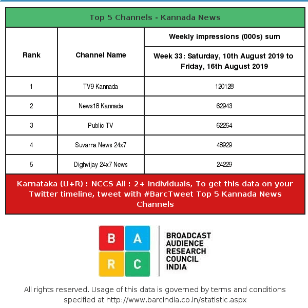 ಬೀರುತ್ತೆ ಅನ್ನೋದು ತಜ್ಞರ ವಾದ. @Jagkb1977 Week 33 data: Kannada News Channels .For custom viewership data, visit https://t.co/CT4Nvm2Rub pic.twitter.com/Scj18ZcdgX— BARCIndia (@BARCIndia) August 22, 2019