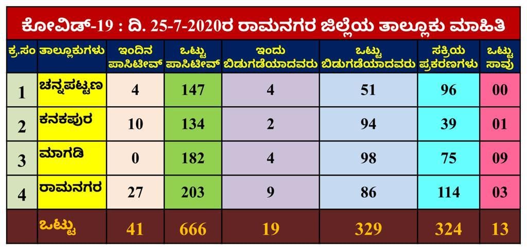 ಜಿಲ್ಲೆಯಲ್ಲಿ ಚನ್ನಪಟ್ಟಣ 4, ಕನಕಪುರ 10 ಮತ್ತು ರಾಮನಗರ 27 ಪ್ರಕರಣಗಳು ಸೇರಿ ಇಂದು ಒಟ್ಟು 41 ಕರೋನಾ ಪಾಸಿಟಿವ್ ಪ್ರಕರಣಗಳು ವರದಿಯಾಗಿದೆ. ಇವರನ್ನು ರಾಮನಗರ ಜಿಲ್ಲೆಯ ವ್ಯಾಪ್ತಿಗೆ ಒಳಪಡುವ ವಿವಿಧ ಕೋವಿಡ್-19 ಆಸ್ಪತ್ರೆಗಳಿಗೆ ದಾಖಲಿಸಿದೆ ಎಂದು ಜಿಲ್ಲಾಧಿಕಾರಿ ಎಂ.ಎಸ್. ಅರ್ಚನಾ ಅವರು ತಿಳಿಸಿದ್ದಾರೆ.
