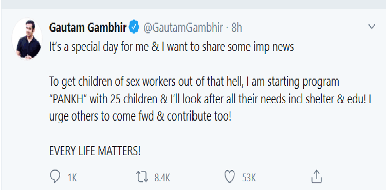 ಅಲ್ಲದೇ ಈ ಕೆಲಸವನ್ನ ಅತ್ಯಂತ ಪ್ರಮುಖವಾದ ದಿನ ಎಂದು ಬಣ್ಣಿಸಿರೋ ಈ ವಿಶ್ವಕಪ್ ಹೀರೋ, ಲೈಂಗಿಕ ಕಾರ್ಯಕರ್ತೆಯರ 25 ಮಕ್ಕಳನ್ನು ಪಾಪ ಕೂಪದಿಂದ ಹೊರ ತರುವ ಉದ್ದೇಶದಿಂದ ಪಂಖ್(ರೆಕ್ಕೆ) ಕಾರ್ಯಕ್ರಮ ಪ್ರಾರಂಭ ಮಾಡಿದ್ದು, ಇದಕ್ಕೆ ಎಲ್ಲರೂ ಕೊಡುಗೆ ನೀಡಿ ಎಂದು ಬಯಸುತ್ತೇನೆ ಎಂದು ಗೌತಮ್ ಗಂಭೀರ್ ಟ್ವೀಟ್ ಮಾಡಿದ್ದಾರೆ.