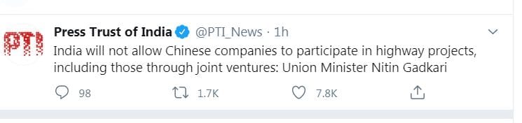 ಚೀನಾದ ಹಲವು ಕಂಪನಿಗಳು ಭಾರತದ ಹೆದ್ದಾರಿ ನಿರ್ಮಾಣ ಯೋಜನೆಗಳಲ್ಲಿ ಕೈ ಹಾಕಿದ್ದವು. ಶಾಂಘೈ ಟನೆಲ್ ಕನ್ಸ್ಟ್ರಕ್ಷನ್, ಸೇರಿದಂತೆ ಹಲವು ಮಧ್ಯಮ ಮತ್ತು ಬೃಹತ್ ಕಂಪನಿಗಳು ಭಾರತದಲ್ಲಿ ಹೆದ್ದಾರಿ ನಿರ್ಮಿಸಲು ದೊಡ್ಡ ಮಟ್ಟದ ಪ್ರಾಜೆಕ್ಟ್ ಹಾಕಿದ್ದವು. ಆದ್ರೆ ಕೇಂದ್ರ ಸರಕಾರದ ಈ ನಿರ್ಧಾರ ಈಗ ಚೀನಾದ ಕನ್ಸ್ಟ್ರಕ್ಷನ್ ಕಂಪನಿಗಳಿಗೆ ನುಂಗಲಾರದ ತುತ್ತಾಗಿದೆ. ಒಟ್ಟಿನಲ್ಲಿ ನರೇಂದ್ರ ಮೋದಿ ನೇತೃತ್ವದ ಸರಕಾರ ಚೀನಾದ ಕುತಂತ್ರ ಬುದ್ದಿಗೆ ನೇರವಾಗಿ ನಿಂತು ಬುದ್ಧಿ ಕಲಿಸುತ್ತಿದೆ.
