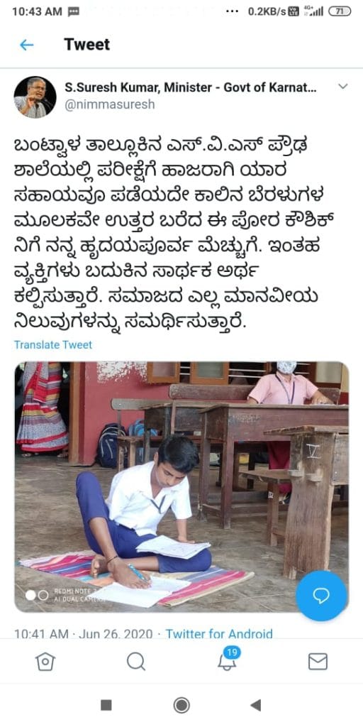 ಕಾಲಲ್ಲೇ ಪರೀಕ್ಷೆ ಬರೆದು ಸಚಿವರ ಮನಗೆದ್ದ ವಿದ್ಯಾರ್ಥಿ- ಕೌಶಿಕ್ ಸಾಹಸಕ್ಕೆ ಸುರೇಶ್ ಕುಮಾರ್ ಸಲಾಂ