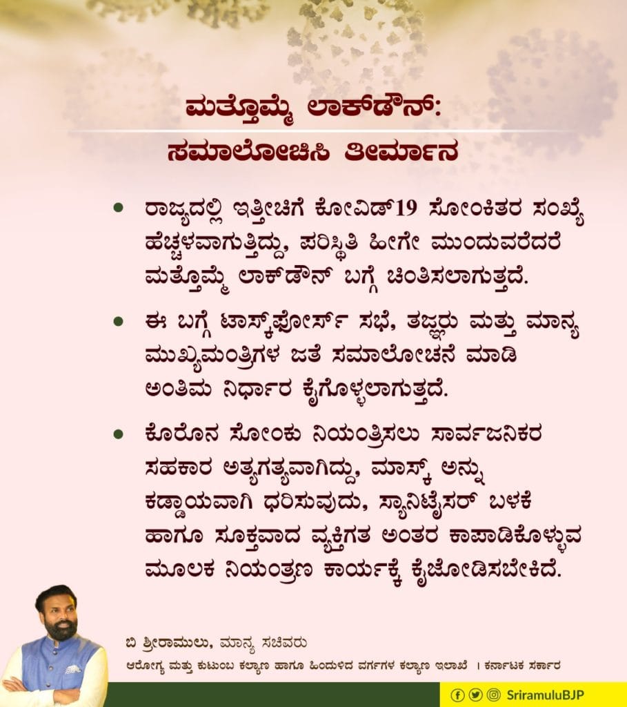 ”ರಾಜ್ಯದಲ್ಲಿ ಇತ್ತೀಚೆಗೆ ಕೋವಿಡ್ 19 ಸೋಂಕಿತರ ಸಂಖ್ಯೆ ಹೆಚ್ಚುಳವಾಗುತ್ತಿದ್ದು, ಪರಿಸ್ಥಿತಿ ಹೀಗೆ ಮುಂದುವರಿದರೆ ಮತ್ತೊಮ್ಮೆ ಲಾಕ್ಡೌನ್ ಬಗ್ಗೆ ಚಿಂತಿಸಲಾಗುತ್ತಿದೆ. ಈ ಬಗ್ಗೆ ಟಾಸ್ಕ್ಫೋರ್ಸ್ ಸಭೆ, ತಜ್ಞರು ಮತ್ತು ಮಾನ್ಯ ಮುಖ್ಯಮಂತ್ರಿಗಳ ಜೊತೆ ಸಮಾಲೋಚನೆ ಮಾಡಿ ಅಂತಿಮ ನಿರ್ಧಾರ ಕೈಗೊಳ್ಳಲಾಗುತ್ತದೆ. ಕೊರೊನಾ ಸೋಂಕು ನಿಯಂತ್ರಿಸಲು ಸಾರ್ವಜನಿಕರ ಸಹಕಾರ ಅತ್ಯಗತ್ಯವಾಗಿದ್ದು, ಮಾಸ್ಕ್ ಅನ್ನು ಕಡ್ಡಾಯವಾಗಿ ಧರಿಸುವುದು, ಸ್ಯಾನಿಟೈಸರ್ ಬಳಕೆ ಹಾಗೂ ಸೂಕ್ತವಾದ ವ್ಯಕ್ತಿಗತ ಅಂತರ ಕಾಪಾಡಿಕೊಳ್ಳುವ ಮೂಲಕ ನಿಯಂತ್ರಣ ಕಾರ್ಯಕ್ಕೆ ಕೈಜೋಡಿಸಬೇಕಿದೆ ಎಂದು ಆರೋಗ್ಯ ಮತ್ತು ಕುಟುಂಬ ಕಲ್ಯಾಣ ಸಚಿವರಾಜ ಬಿ. ಶ್ರೀರಾಮುಲುರವರು ತಿಳಿಸಿದ್ದಾರೆ.”