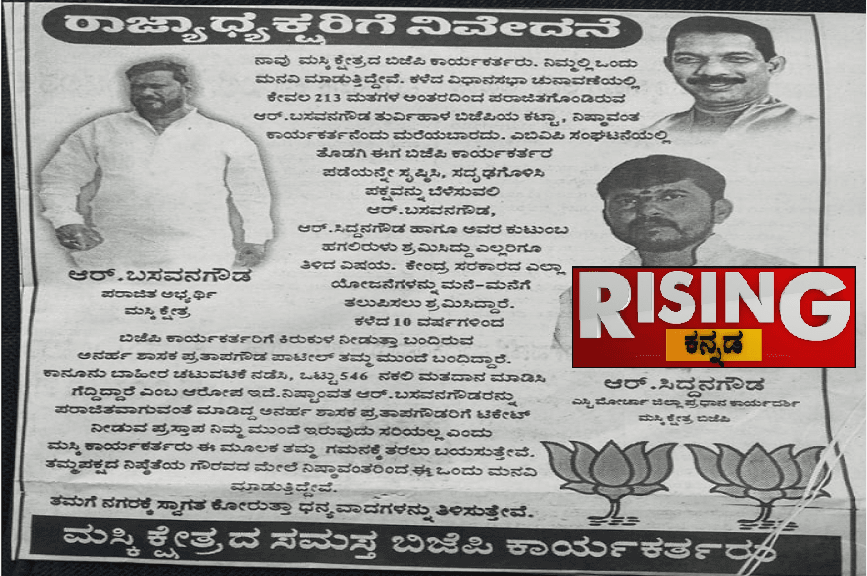 ನಿಷ್ಠಾವಂತರನ್ನು ಕೈಬಿಡಬೇಡಿ : ಬಿಜೆಪಿ ರಾಜ್ಯಾಧ್ಯಕ್ಷರಿಗೆ ಪತ್ರಿಕೆಯಲ್ಲಿ ಜಾಹೀರಾತು ನೀಡಿದ ಮಸ್ಕಿ ಬಿಜೆಪಿ ಕಾರ್ಯಕರ್ತರು..!