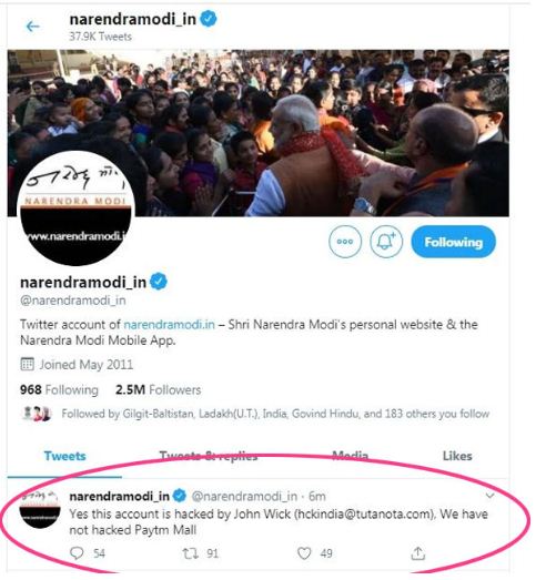 ಜಾನ್ ವಿಕ್ ಎಂಬಾತನೆ ಹ್ಯಾಕ್ ಆಗಿದ್ದು ಬಿಟ್ ಕಾಯಿನ್ ಕೊಡುವಂತೆ ಮನವಿ ಮಾಡಿದ್ದಾರೆ. ಈ ಖಾತೆಯಲ್ಲಿ 6.1 ಕೋಟಿ ಹಿಂಬಾಲಕರಿದ್ದಾರೆ.