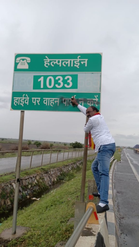 ಕರ್ನಾಟಕದಲ್ಲಿ ಕನ್ನಡ ಬಾಷೆಯನ್ನೇ ಬಳಸಬೇಕೆಂದು ಒತ್ತಾಯಿಸಿ ರಾಷ್ಟ್ರೀಯ ಹೆದ್ದಾರಿ 4 ರಲ್ಲಿ ಹಿಂದಿ ನಾಮಫಲಕಳಿಗೆ ಮಸಿ ಬಳಿದರು. ಕರ್ನಾಟಕದಲ್ಲಿ ಹಿಂದಿ ನಾಮಫಲಕ ತೆರವು ಮಾಡಬೇಕೆಂದು ಆಗ್ರಹಿಸಿದರು.