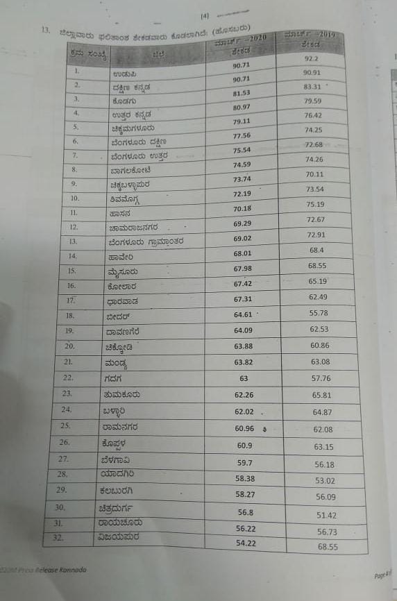 ಇನ್ನೂ ಜಿಲ್ಲಾವಾರು ಫಲಿತಾಂಶವನ್ನ ನೋಡೋದಾದ್ರೆ, ಉಡುಪಿ ಮತ್ತು ದಕ್ಷಿಣ ಕನ್ನಡ ಜಿಲ್ಲೆಗಳು ಪ್ರಥಮ ಸ್ಥಾನವನ್ನ ಹಂಚಿಕೊಂಡಿವೆ. ಕೊಡಗು ಜಿಲ್ಲೆ ದ್ವಿತೀಯ ಸ್ಥಾನಕ್ಕೆ ಲಗ್ಗೆ ಇಟ್ಟಿದೆ. ಉತ್ತರ ಕನ್ನಡ ಜಿಲ್ಲೆ ಮೂರನೇ ಸ್ಥಾನದಲ್ಲಿದೆ. ಇನ್ನೂ ವಿಜಯಪುರ ಮತ್ತು ರಾಯಚೂರು ಜಿಲ್ಲೆಗಳು ಕೊನೆಯ ಸ್ಥಾನವನ್ನ ಹಂಚಿಕೊಂಡಿವೆ.