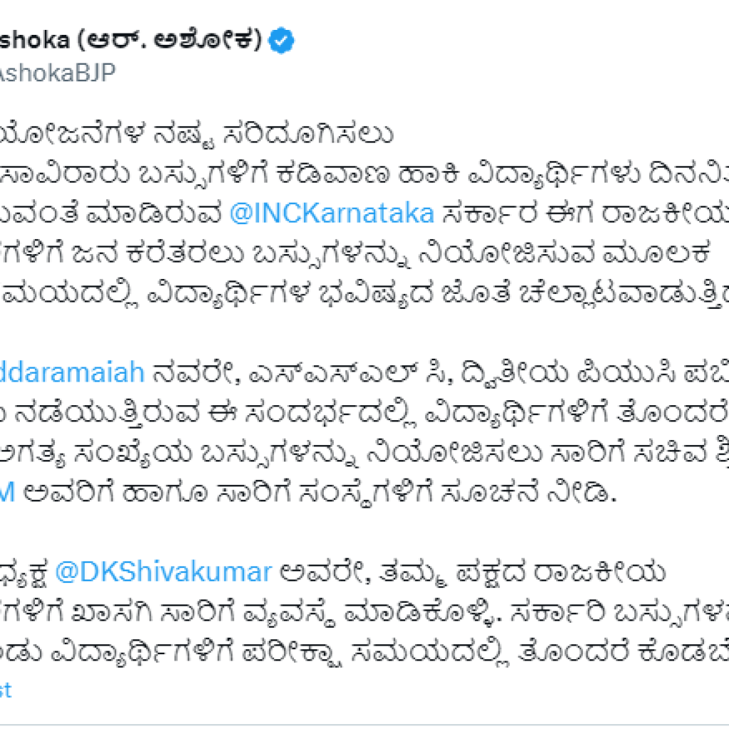 ಈ ಬಗ್ಗೆ ಎಕ್ಸ್ ಖಾತೆಯಲ್ಲಿ ಆಕ್ರೋಶ ವ್ಯಕ್ತಪಡಿಸಿರೋ ಆರ್.ಅಶೋಕ್, ಸಿಎಂ @siddaramaiah ನವರೇ, ಎಸ್ಎಸ್ಎಲ್ ಸಿ, ದ್ವಿತೀಯ ಪಿಯುಸಿ ಪಬ್ಲಿಕ್ ಪರೀಕ್ಷೆಗಳು ನಡೆಯುತ್ತಿರುವ ಈ ಸಂದರ್ಭದಲ್ಲಿ ವಿದ್ಯಾರ್ಥಿಗಳಿಗೆ ತೊಂದರೆ ಆಗದಂತೆ ಅಗತ್ಯ ಸಂಖ್ಯೆಯ ಬಸ್ಸುಗಳನ್ನು ನಿಯೋಜಿಸಲು ಸಾರಿಗೆ ಸಚಿವ ರಾಮಲಿಂಗಾ ರೆಡ್ಡಿ ಹಾಗೂ ಸಾರಿಗೆ ಸಂಸ್ಥೆಗಳಿಗೆ ಸೂಚನೆ ನೀಡಿ ಎಂದು ಆಗ್ರಹಿಸಿದ್ದಾರೆ.