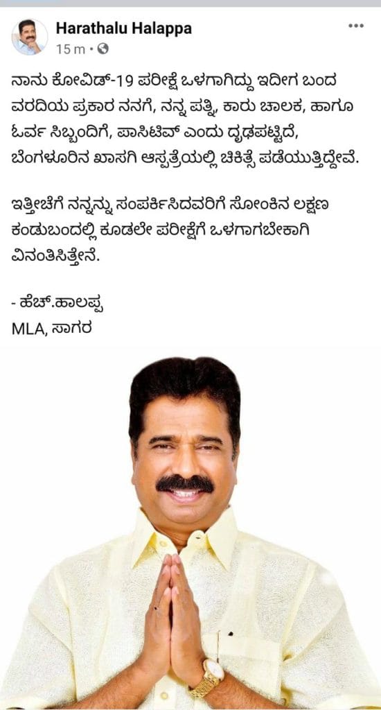 ಎಂಎಸ್ಐಎಲ್ ಬೋರ್ಡ್ ಅಧ್ಯಕ್ಷರೂ ಆಗಿರುವ ಶಾಸಕ ಹರತಾಳು ಹಾಲಪ್ಪ ಕೊರೊನಾ ವಿಷ್ಯವನ್ನ ದೃಢಪಡಿಸಿದ್ದಾರೆ. ಈ ಬಗ್ಗೆ ಫೇಸ್ಬುಕ್ನಲ್ಲಿ ಮಾಹಿತಿ ಹಂಚಿಕೊಂಡಿದ್ದಾರೆ.