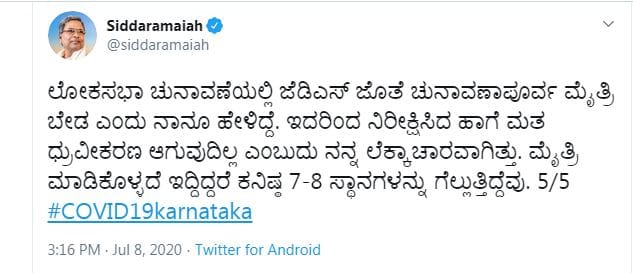 JDS ಜೊತೆಗಿನ ಮೈತ್ರಿಯೇ ಸೋಲಿಗೆ ಕಾರಣ – ಟ್ವಿಟ್ಟರ್​ನಲ್ಲಿ ಮಾಜಿ ಸಿಎಂ ತಿರುಗುಬಾಣ