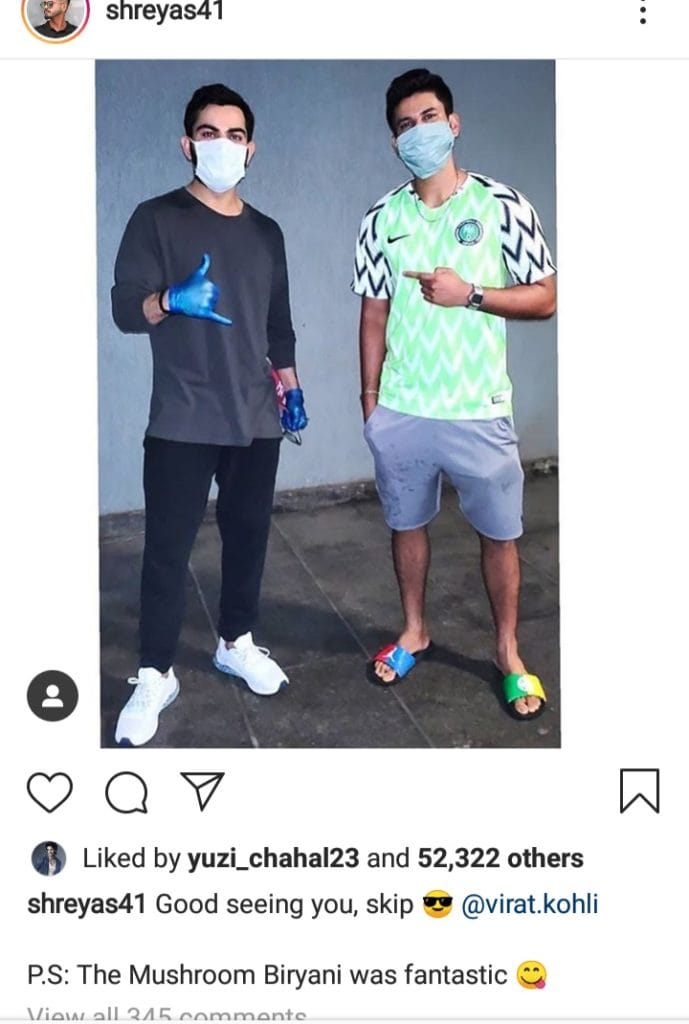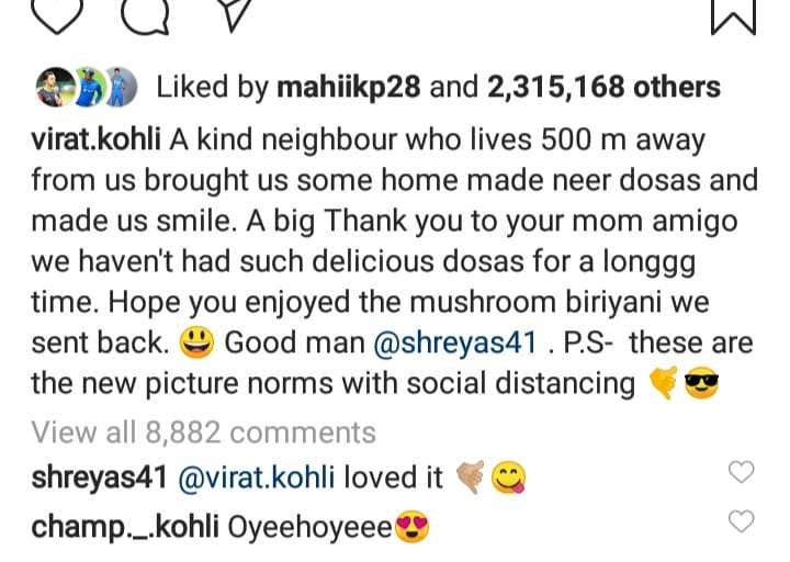 ವಿಶೇಷ ಅಂದ್ರೆ, ವಿರಾಟ್ ಮತ್ತು ಶ್ರೇಯಸ್ ಅಯ್ಯರ್ ಇಬ್ಬರೂ ಕೂಡ ಮಾಸ್ಕ್ ಧರಿಸಿನಿಂತು ಫೋಟೋಗೆ ಪೋಸ್ ನೀಡಿದ್ದಾರೆ. ಈ ಮೂಲಕ ಕೊರೊನಾ ಜಾಗೃತಿಯನ್ನ ಕೂಡ ಮಾಡಿದ್ದಾರೆ. ಇನ್ನೂ ಸ್ಪೆಷಲ್ ನ್ಯೂಸ್ ಅಂದ್ರೆ, ಶ್ರೇಯಸ್ ಅಯ್ಯರ್ ಮನೆಯಲ್ಲಿ ದೋಸೆ ತಿಂದು ಬಂದಿರೋ ವಿರಾಟ್ ಕೊಹ್ಲಿ, ತಮ್ಮ ಮನೆಯಲ್ಲಿ ಮಶ್ರೂಮ್ ಬಿರಿಯಾನಿಯನ್ನ ಕಳುಹಿಸಿಕೊಟ್ಟಿದ್ದಾರೆ. ಈ ವಿಷ್ಯವನ್ನ ಶ್ರೇಯಸ್ ಹಂಚಿಕೊಂಡಿದ್ದಾರೆ. ಥ್ಯಾಂಕ್ಸ್ ಫಾರ್ ದಿ ಮಶ್ರೂಮ್ ಬಿರಿಯಾನಿ ಅಂತ ತಮ್ಮ ಇನ್ಸ್ಟಾಗ್ರಾಮ್ನಲ್ಲಿ ಹಂಚಿಕೊಂಡಿದ್ದಾರೆ. ಅಷ್ಟಕ್ಕೂ ದೆಹಲಿಯಲ್ಲಿ ವಿರಾಟ್ ಮತ್ತು ಶ್ರೇಯಸ್ ಮನೆಗಳು ಕೇವಲ 500 ಮೀಟರ್ ಅಂತರದಲ್ಲಿ ಇವೆಯಂತೆ.